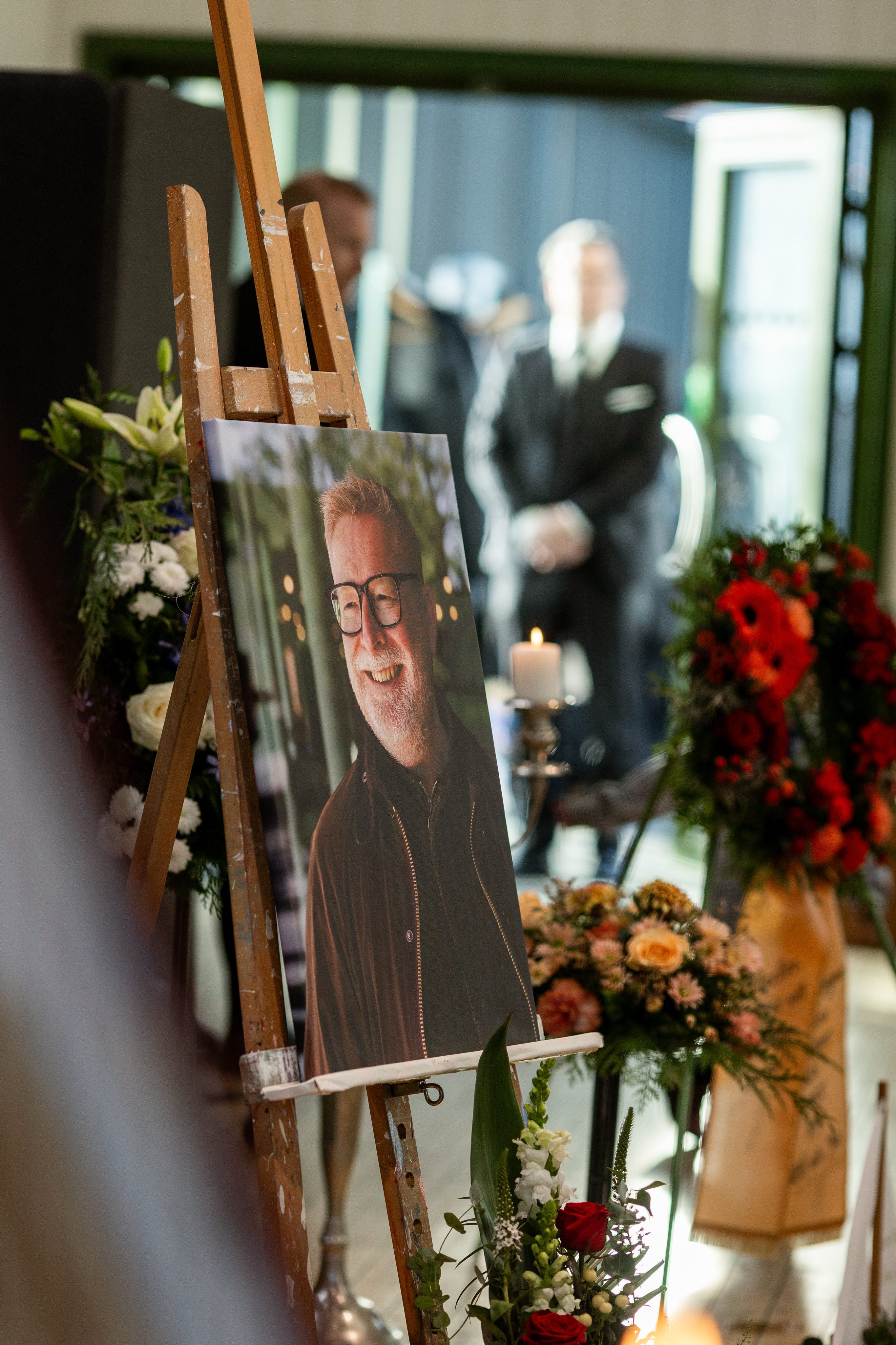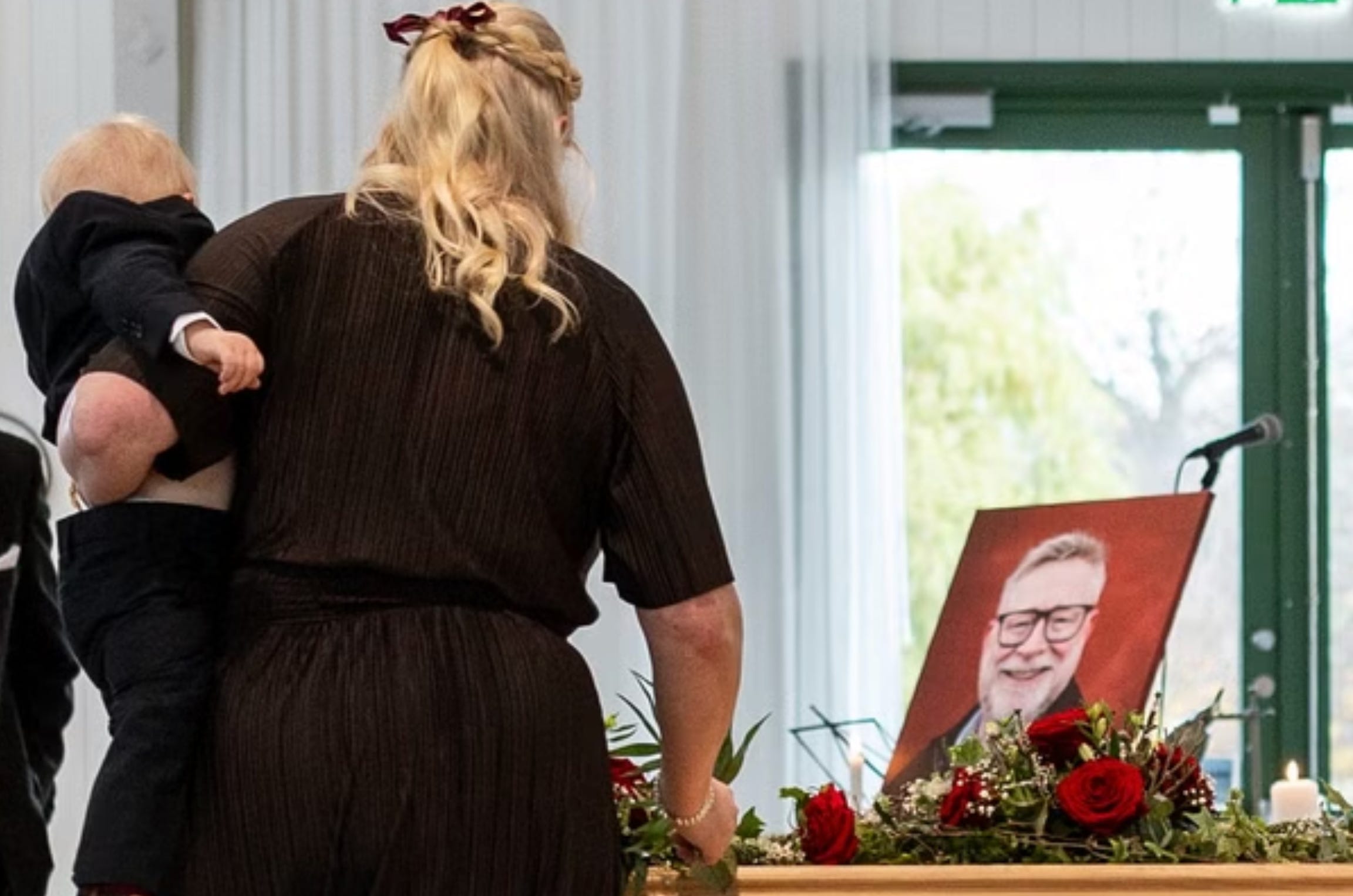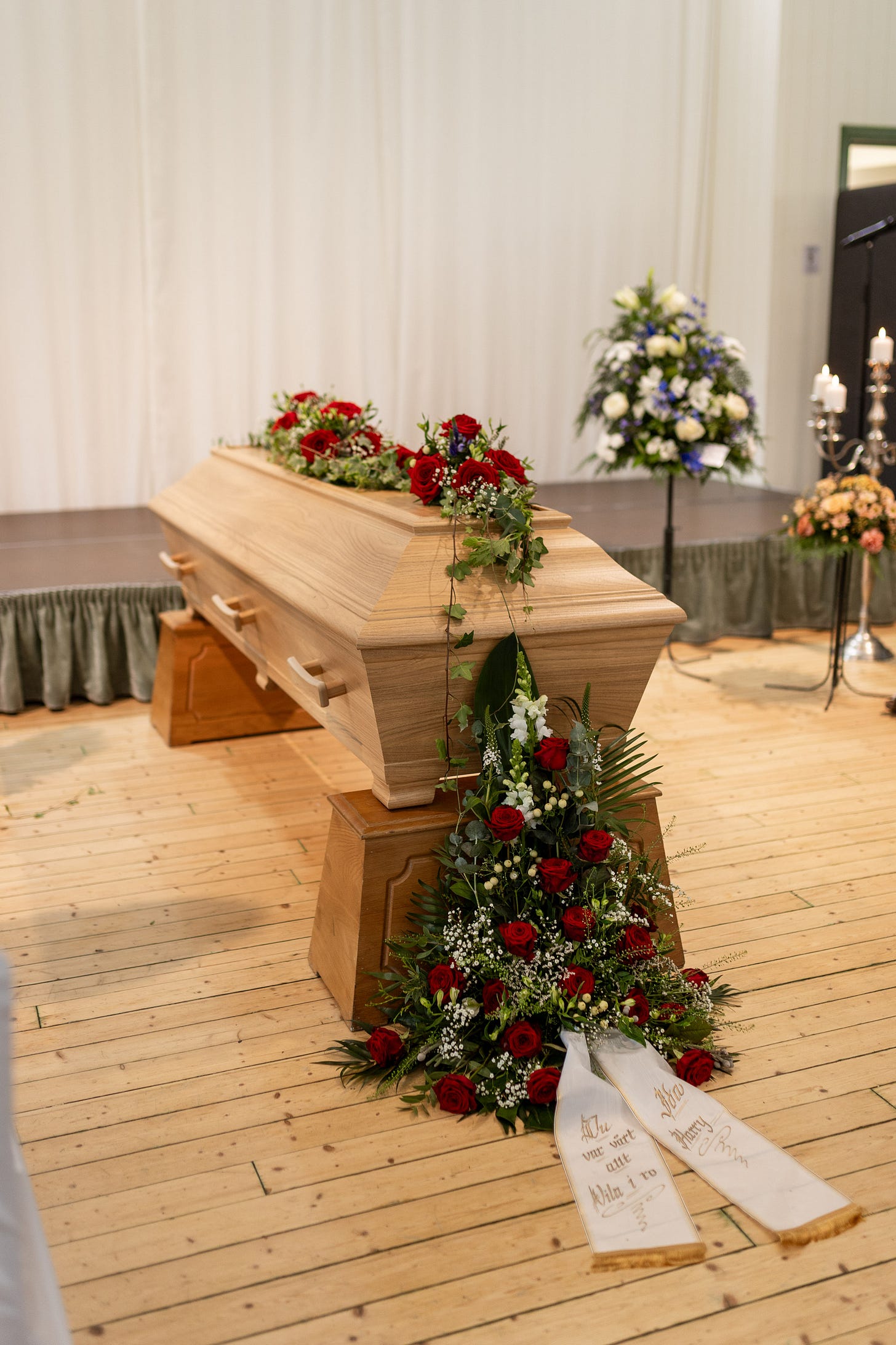 Vi fick 4 år som ett par. 4 år och 4 liv. 2 av dessa år fick vi vara gifta. På kistan ligger också en blå blomsterdekoration. Den representerar Harry, vårt enda barn och vårt livs största lycka.